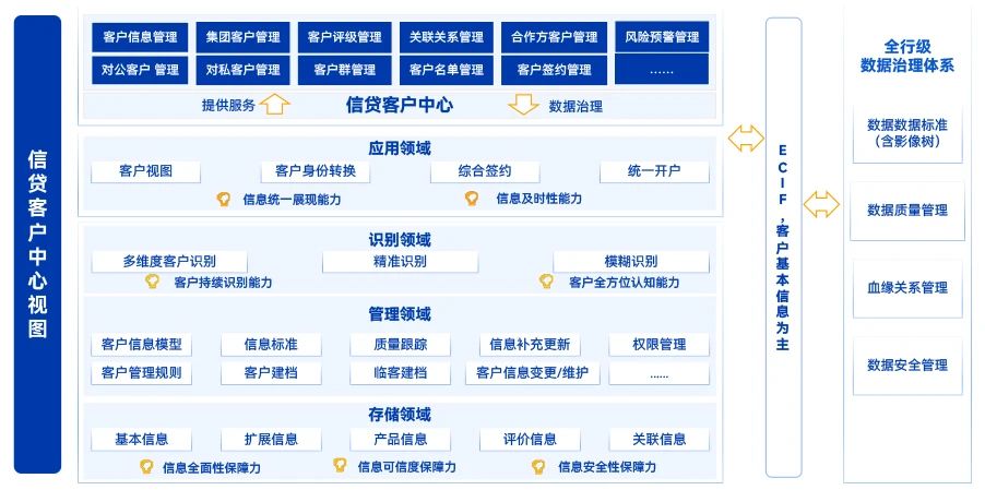 長亮科技統一客戶管理中心的整體設計,是基于全行的客戶數據管理與數據治理體系,以存儲領域、管理領域、識別領域、應用領域的數據為資源,進行數據資產服務化,以業務為中心的數據化運營。