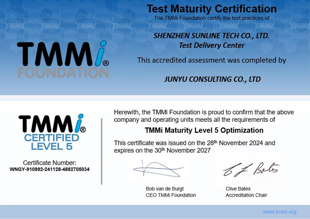TMMi(Test Maturity Model Integration,測(cè)試成熟度模型集成)作為國(guó)際公認(rèn)的測(cè)試管理體系構(gòu)建和測(cè)試過程改進(jìn)權(quán)威評(píng)估標(biāo)準(zhǔn),旨在支持世界各地的組織改進(jìn)其軟件和系統(tǒng)測(cè)試成熟度,其認(rèn)證體系涵蓋了從需求分析、設(shè)計(jì)開發(fā)、項(xiàng)目管理直至產(chǎn)品交付的全生命周期管理,是企業(yè)軟件產(chǎn)品質(zhì)量管理水平最有力的資質(zhì)證明。TMMi認(rèn)證共分為五個(gè)成熟度級(jí)別,其中5級(jí)是對(duì)測(cè)試組織成熟度的最高認(rèn)證。