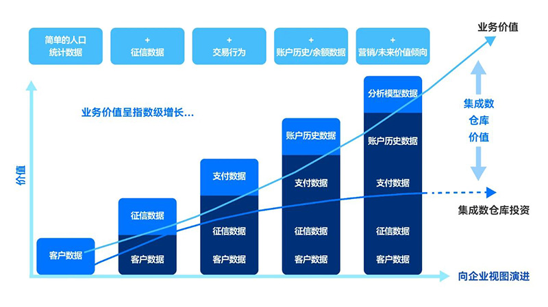 與分散的數據集市環境存在顯著不同,在企業集成數據環境中可以回答的跨領域的業務問題,隨著集成數據領域的增加,能回答的問題呈指數級增長,這是回答新問題、產生新價值的來源。