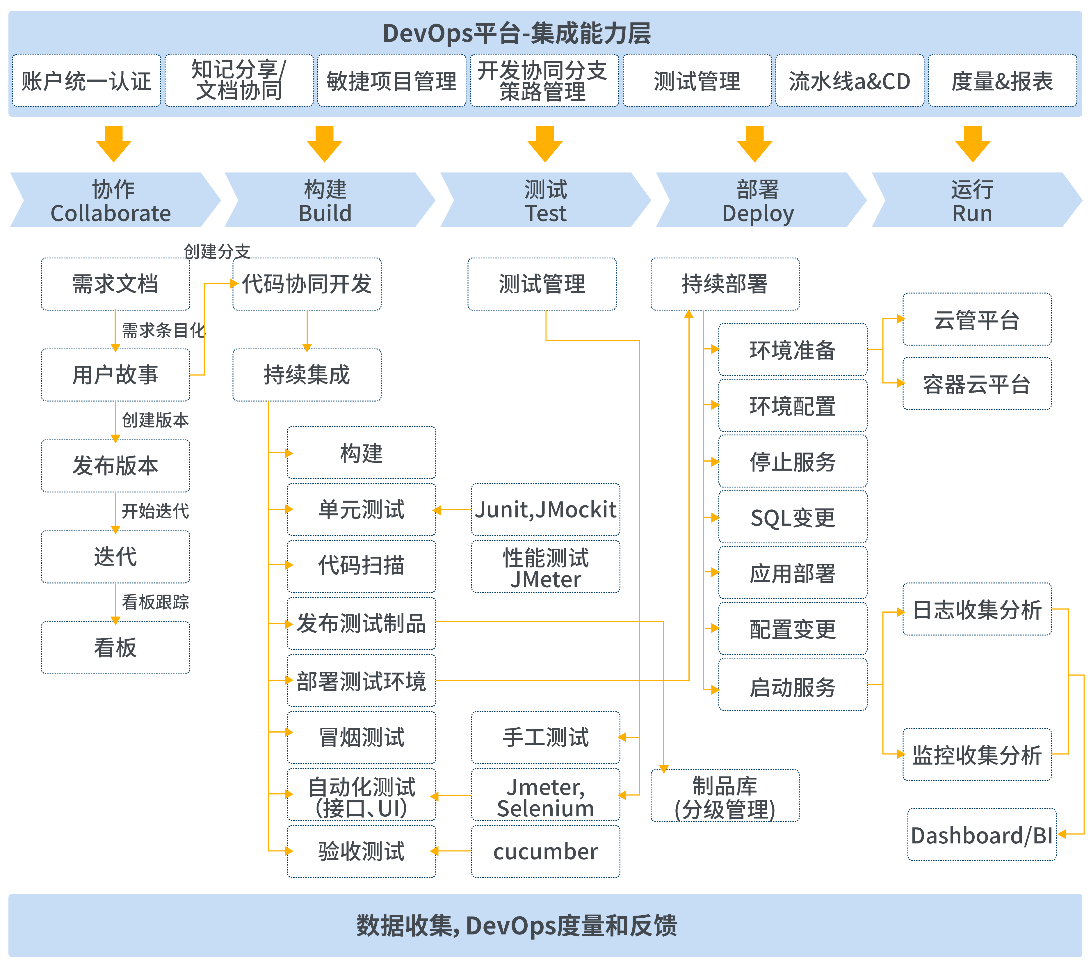 • 組件集成能力:提供組件間深度集成能力,如項目管理工具與代碼版本管理工具在用戶故事關聯方面的集成能力、代碼版本管理工具與持續集成工具在分支代碼變動觸發持續集成流水線能力、組件關鍵事件收集、分析和度量能力