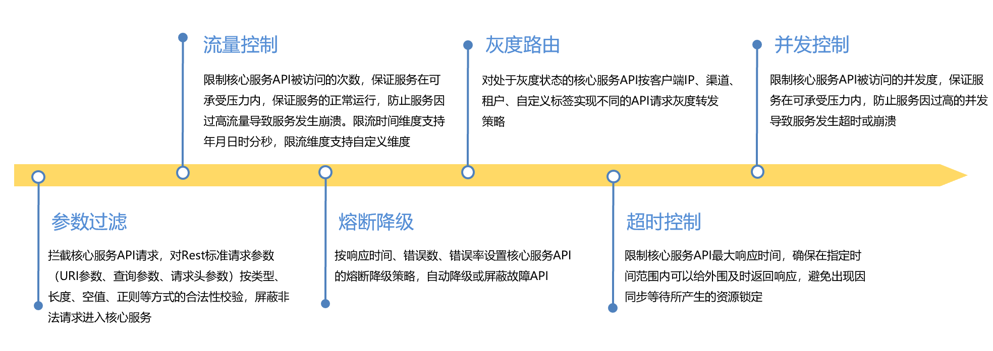 ●  治理體系:從限流控制、參數過濾、熔斷降級、灰度路由、超時控制、并發控制、訪問時段控制等維度對API訪問進行全方位治理。