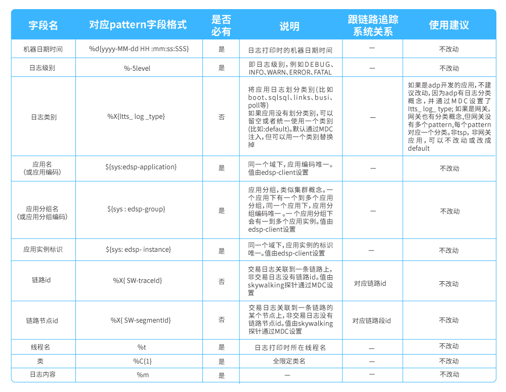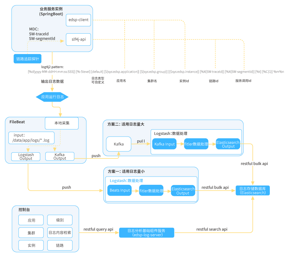 ●  應用日志分析:在日志收集和分析領域EFK是普遍采用的技術方案,但在應用日志分析的落地使用上,應用日志規范才是其核心的價值體系,對于企業級微服務日志觀測方面,日志規范體系需要在日志組件上落地以此作強規范約束;將規范中的某些關鍵數據以MDC方式注入,并按標準輸出到日志文件,日志收集組件到指定路徑收集日志數據推送至日志分析組件,日志分析組件按規范解析日志數據并進行持久化;平臺通過日志分析服務獲取日志數據。