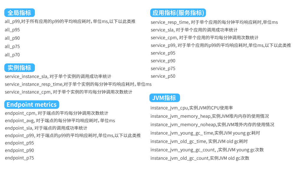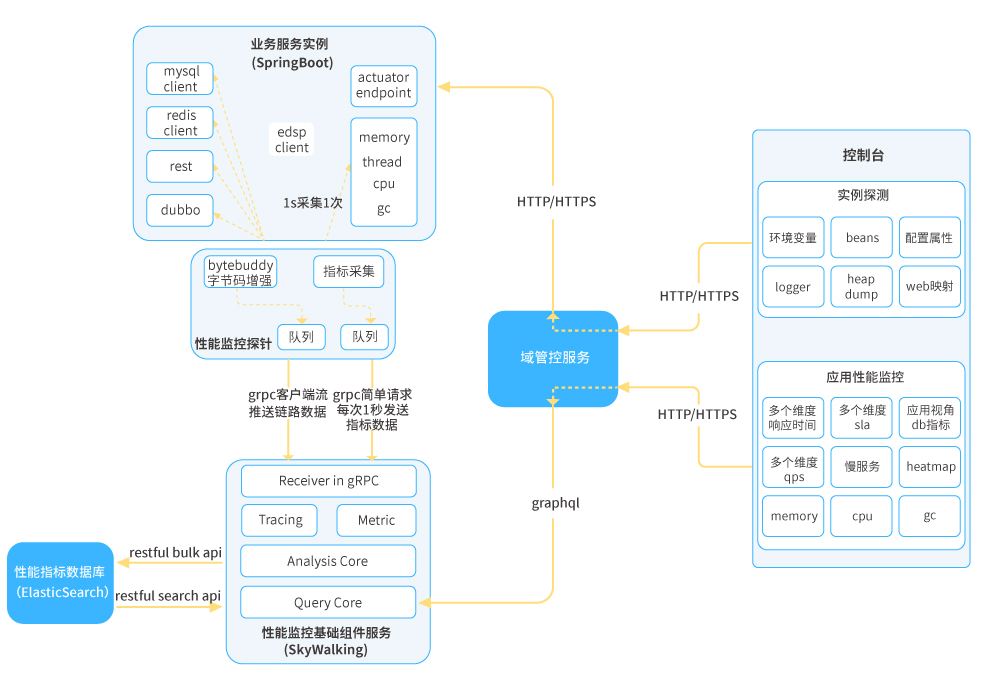 ●  性能監控:為了實現對業務應用的零代碼侵入,可采用Java探針技術實現對微服務應用的性能數據采集,如Skywalking APM Agent;從應用、集群、端口等維度收集性能數據,性能數據包括但不局限于:服務可用級別、響應時間、每分鐘調用數、百分位響應耗時、CPU、內存、GC情況等。應用實例通過平臺SDK注冊到平臺獲取到APM組件信息,通過APM組件客戶端對APM組件進行相關初始化操作,之后依托Agent字節碼增強技術在相應位置進行埋點,定時將性能數據推送至APM組件進行分析并持久化;平臺本身通過訪問APM組件暴露的端點獲取相關性能數據。