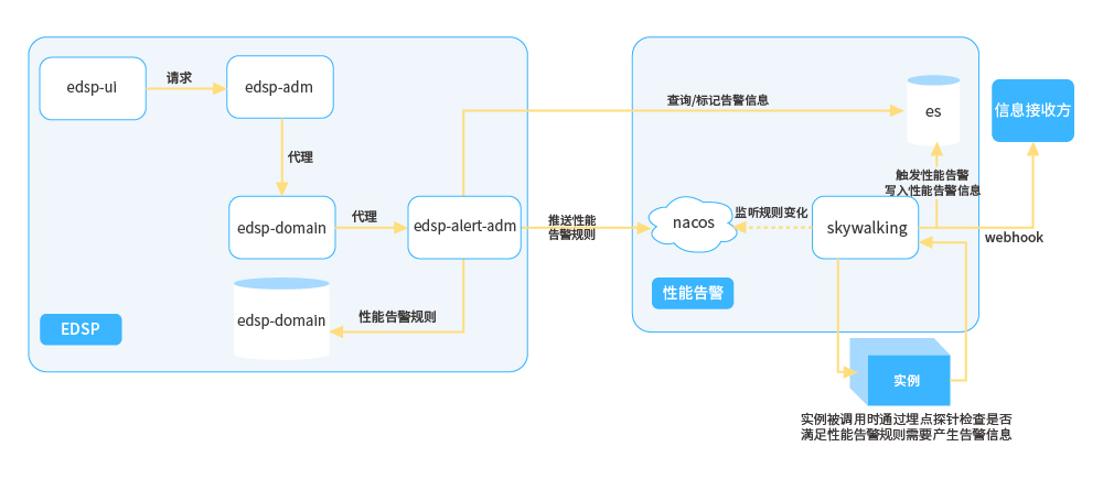 ●  性能告警:通過管控端配置告警規則提交到告警管理模塊落庫持久化,同時將告警規則推送至配置中心,性能告警組件依賴配置中心可以動態感知告警規則的變化并實時生效,然后在APM預處理接收的性能指標數據時立刻計算告警規則,對于滿足告警規則的指標數據立刻生成相應的告警事件,并持久化,隨后產生相關告警數據,并將告警數據持久化,同時推送至告警推送系統進行下一步推送操作。