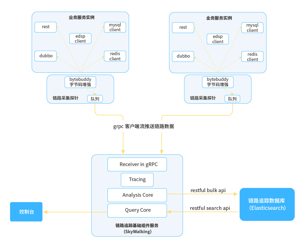 ●  鏈路追蹤:與性能監控探針技術類似,利用Java探針技術,遵循OpenTracing標準,收集全鏈路數據,并分析鏈路數據形成調用拓撲;應用實例通過平臺SDK注冊到平臺獲取到APM組件信息,通過APM組件客戶端對APM組件進行相關初始化操作,之后依托Agent字節碼增強技術在相應位置進行埋點,定時將鏈路數據推送至APM組件進行分析并持久化,同時將MDC信息填充到日志,從而實現鏈路與日志的聯動;平臺本身通過訪問APM組件暴露的端點獲取相關鏈路數據。