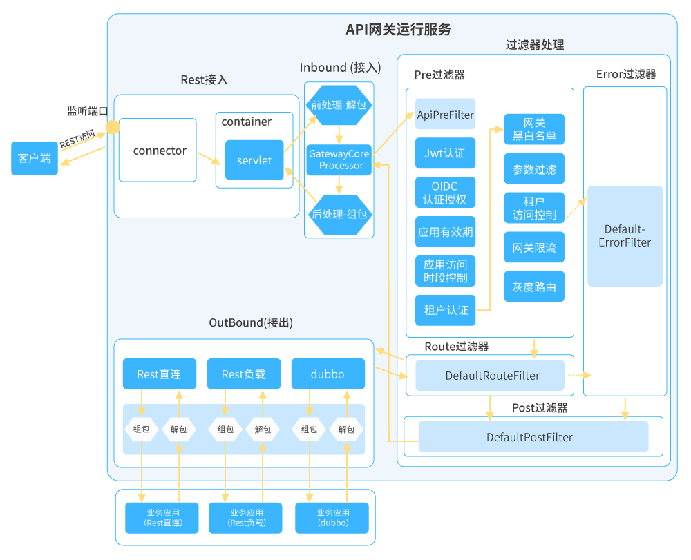 ●  所有過濾器都正常執行則走到路由過濾器根據接出協議將網關內部請求對象轉換成接出請求對象進行外部調用,調用成功拿到接出響應對象再轉換為網關內部響應對象;