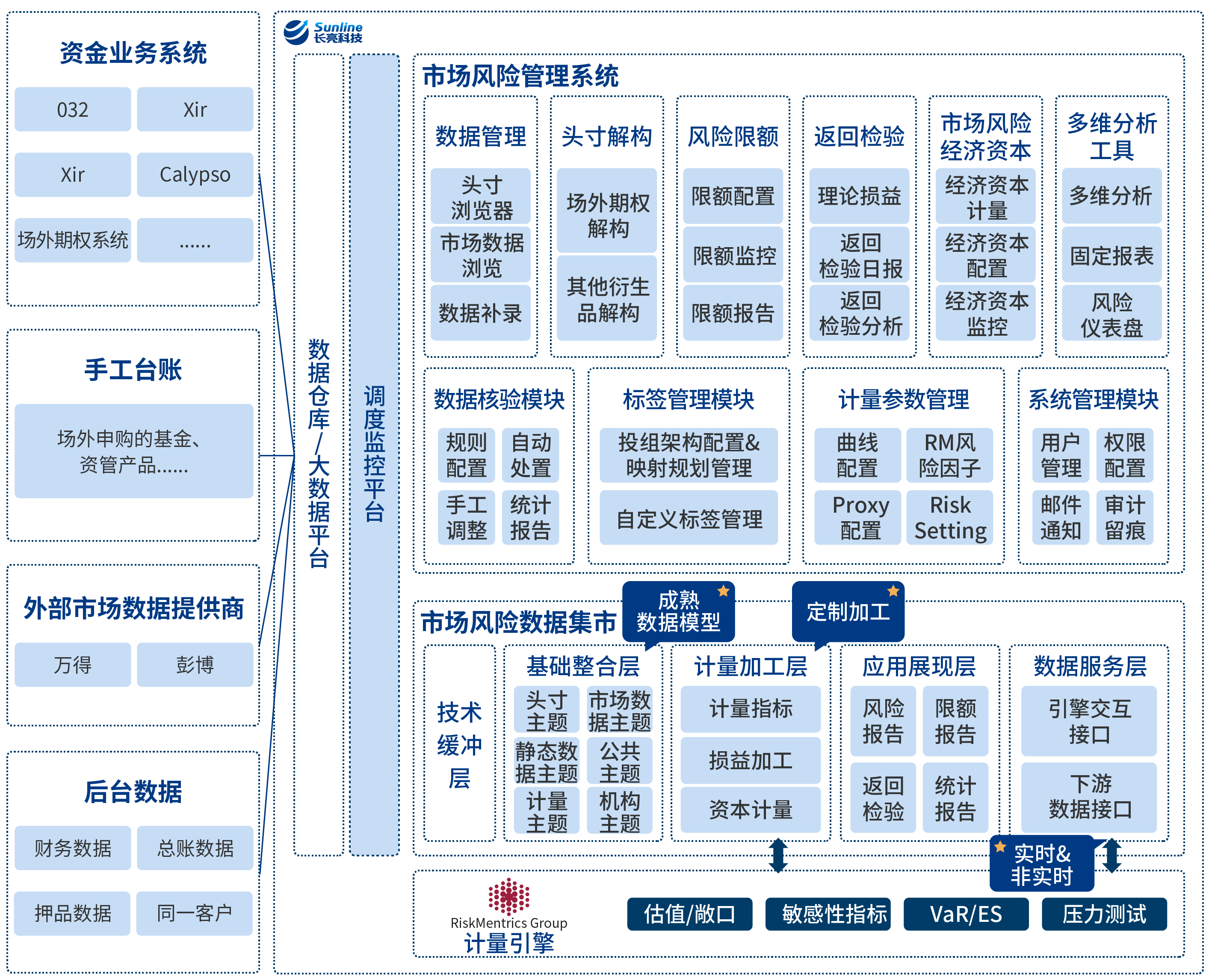 基于成熟的市場風(fēng)險計量引擎和引擎廠商提供的相關(guān)產(chǎn)品及咨詢服務(wù),結(jié)合最新的監(jiān)管規(guī)定和領(lǐng)先的同業(yè)實踐,調(diào)研證券公司自身的系統(tǒng)和數(shù)據(jù)環(huán)境,完成數(shù)據(jù)到計量結(jié)果的全流程展示,并支持新產(chǎn)品及業(yè)務(wù)功能的個性化擴展,為證券公司提供專業(yè)的市場風(fēng)險管理系統(tǒng)。