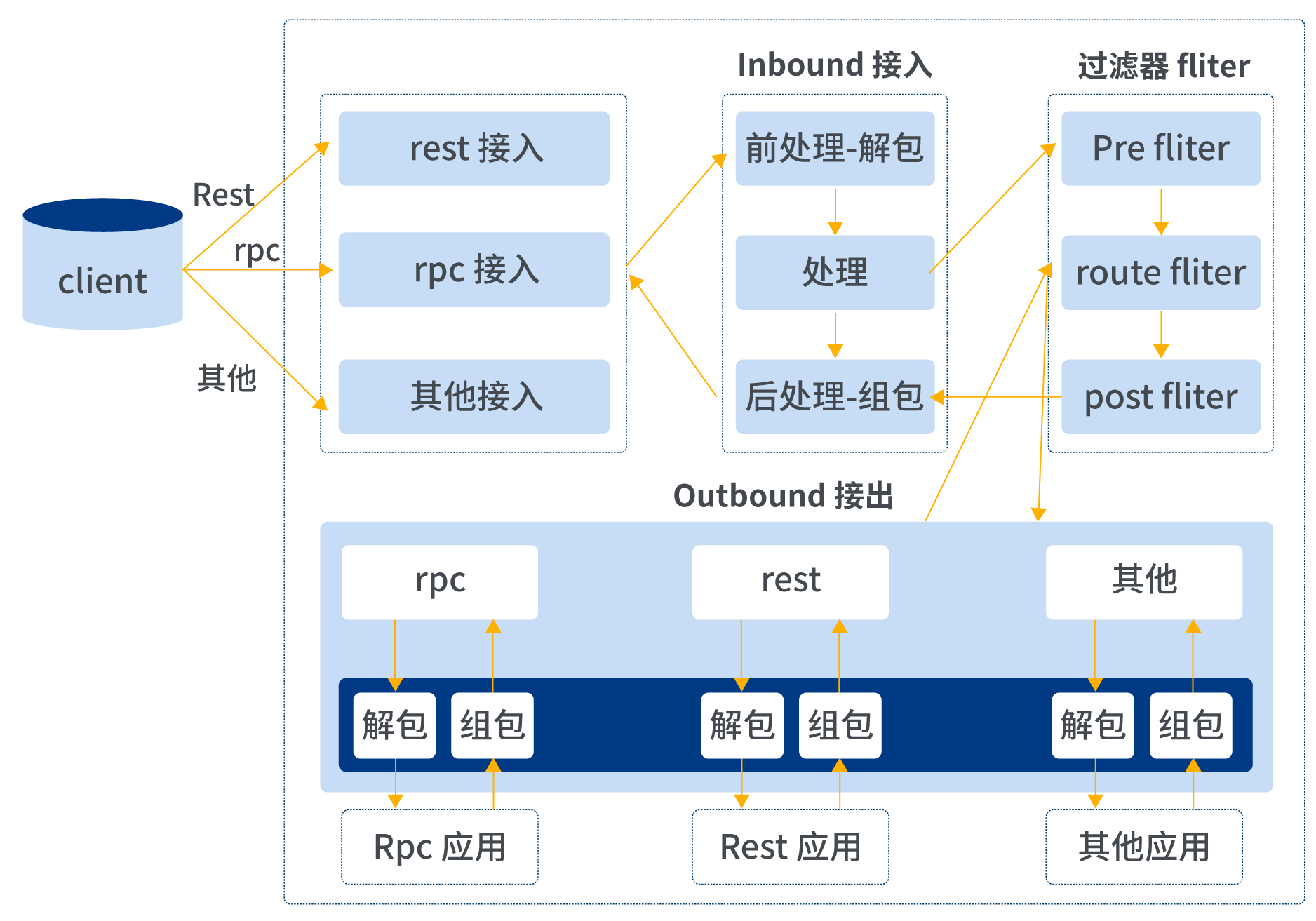 網(wǎng)關(guān)運行端采用了SPI機制,大大的增加了網(wǎng)關(guān)的擴展性,除市面上都支持的Fileter擴展、治理功能的擴展外,長亮科技還可提供接入接出(協(xié)議)的擴展,加解密方式、報文等多處位置的擴展,大大增加了網(wǎng)關(guān)的可擴展點: